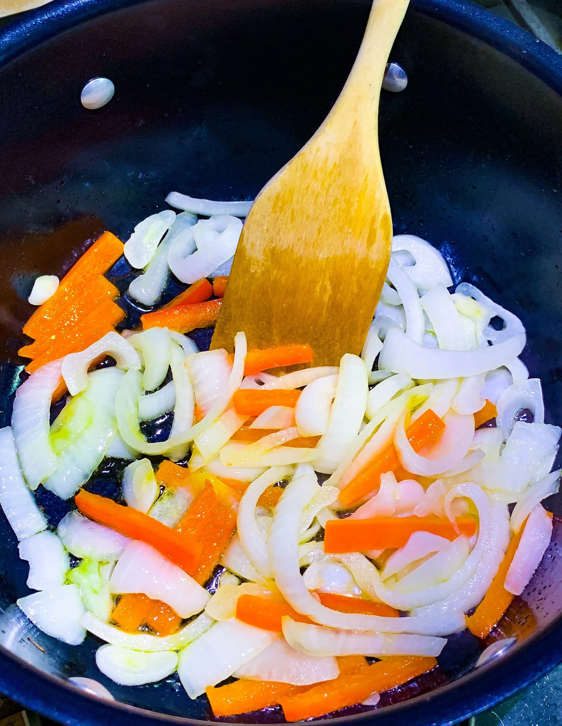 In a large pot over medium heat, warm olive oil and saute your onions and peppers until soft. Approximately 8-10 minutes.