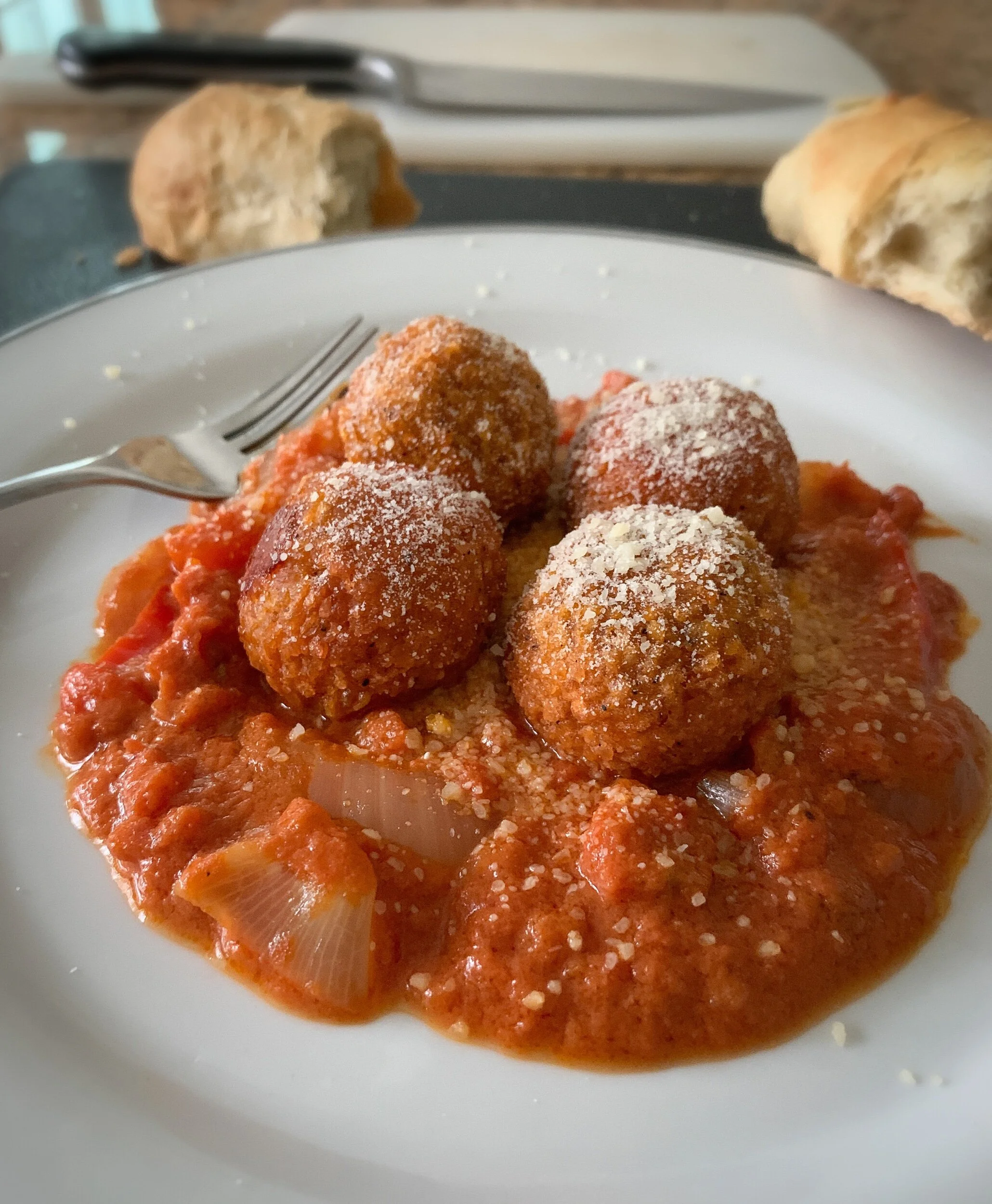 Hubby gives it two thumbs up. He is a carnivorous man, so if he approves of meatless meatballs -ya know it’s good!