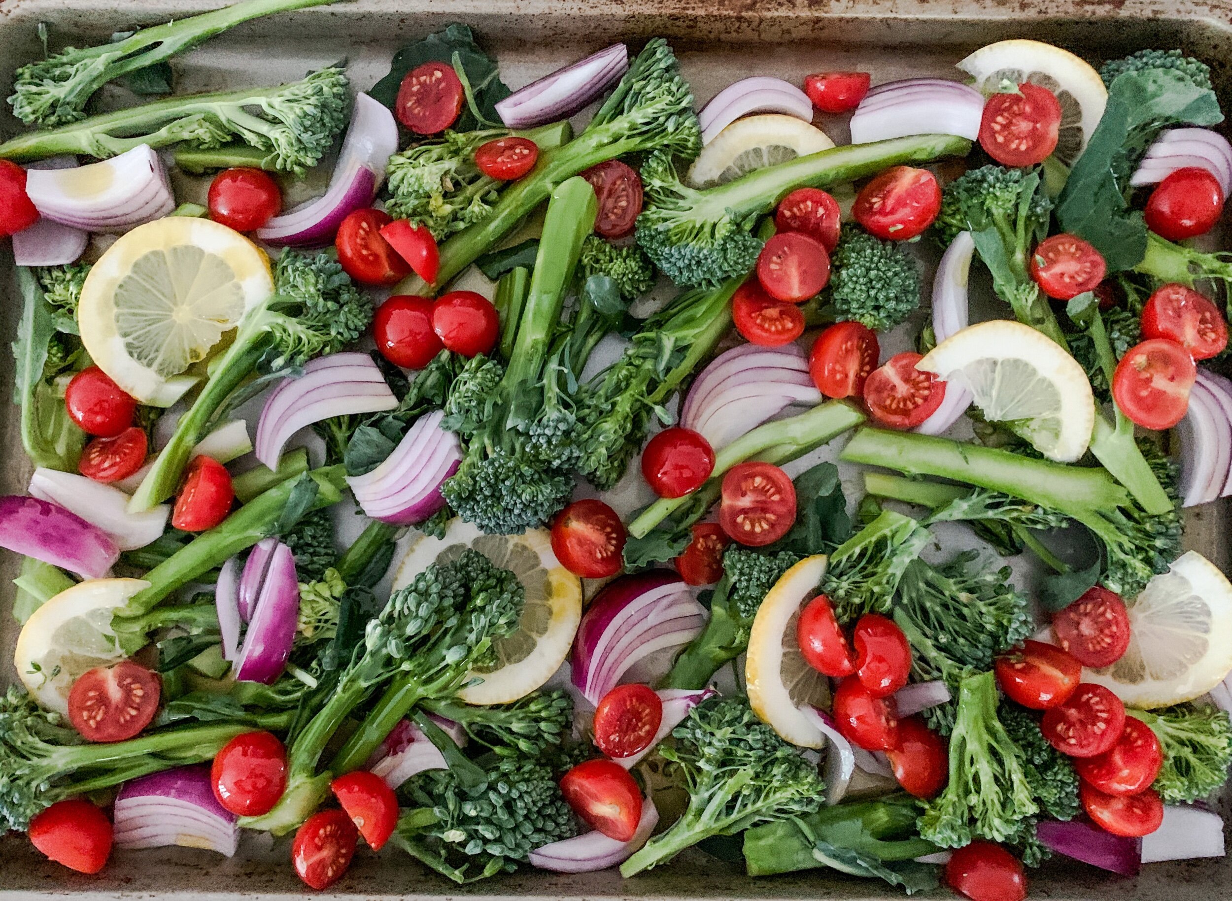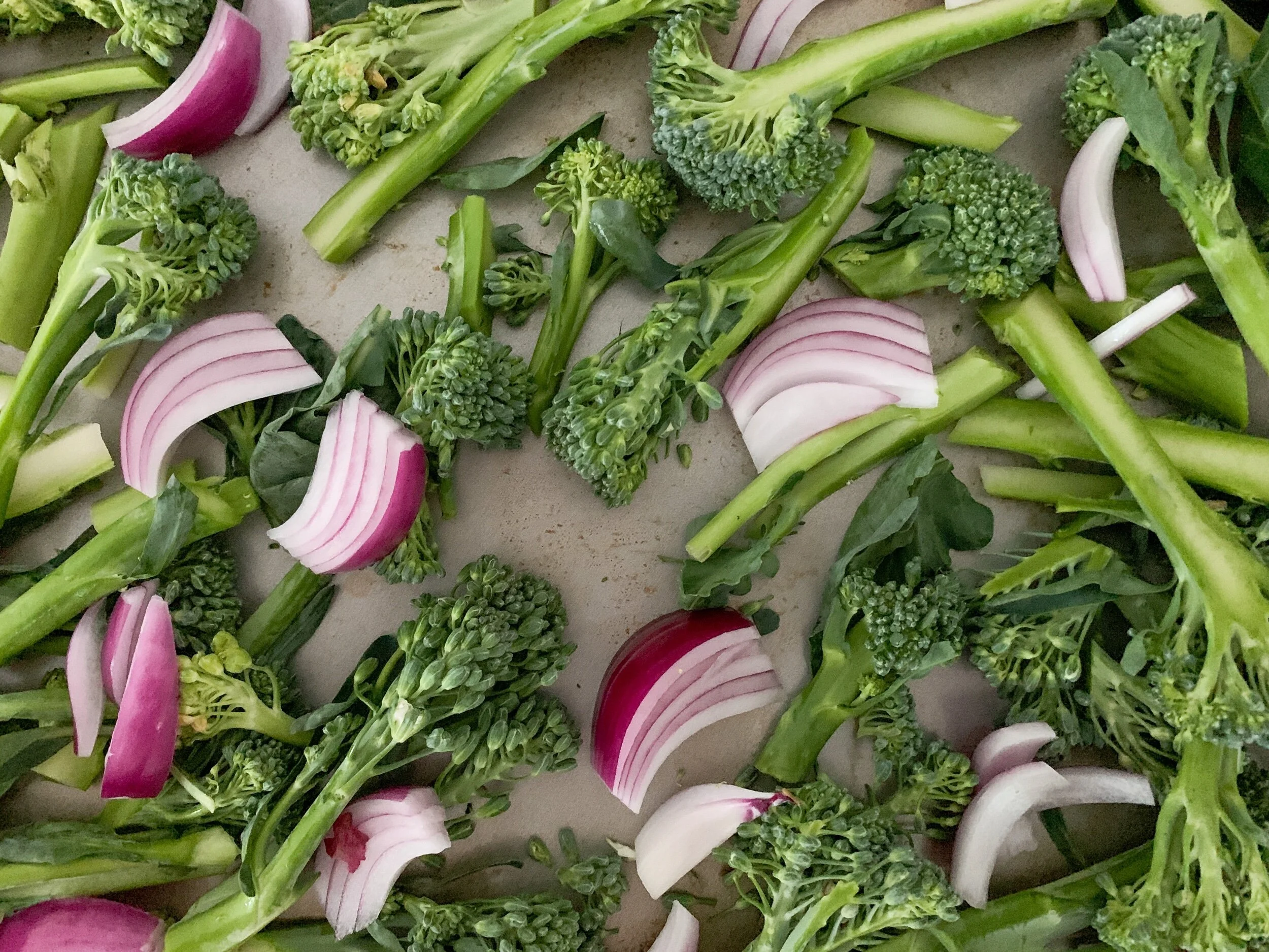 All you have to do is split the broccolini in half, cut into bite size pieces, halve tomatoes, carve an onion into wedges and slice half of a lemon. Anybody can that and it takes no time!