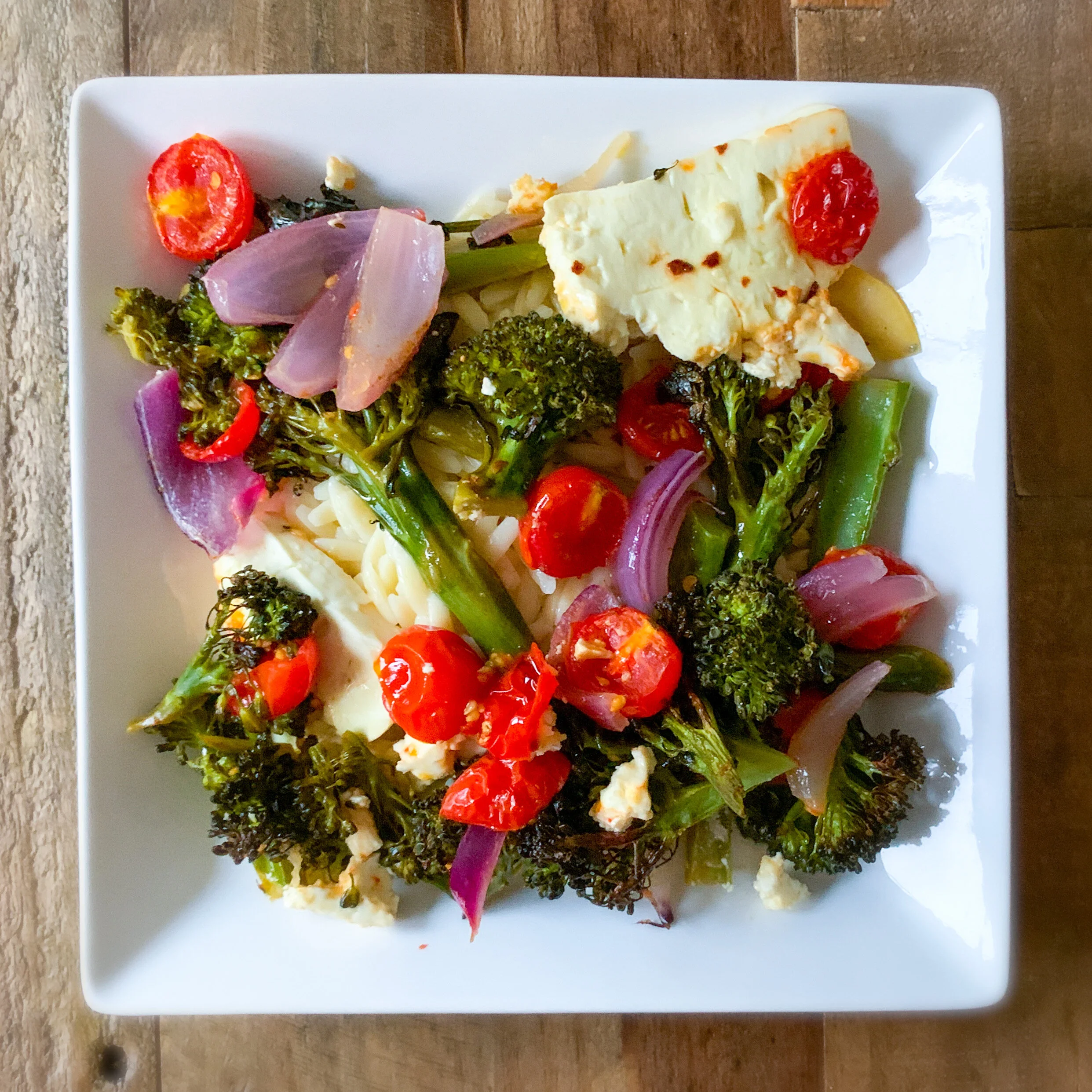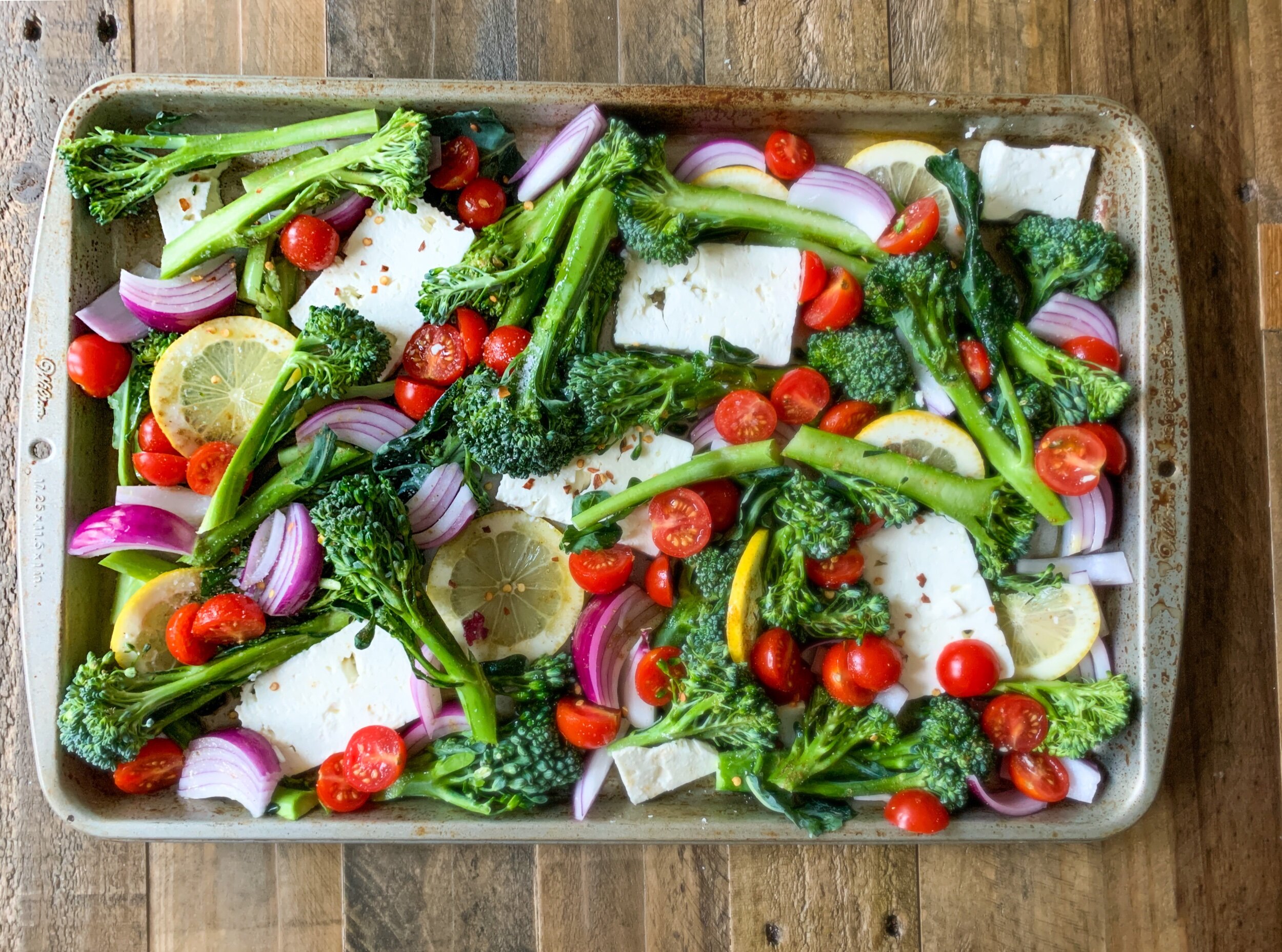 While the oven is heating and you are waiting for water to boil prepare broccolini, onion, tomatoes and lemon. Spread out all over a sheet pan. Evenly coat with olive oil, then add spices and gently mix. Place feta slices in between vegetables. Salt and pepper to taste.