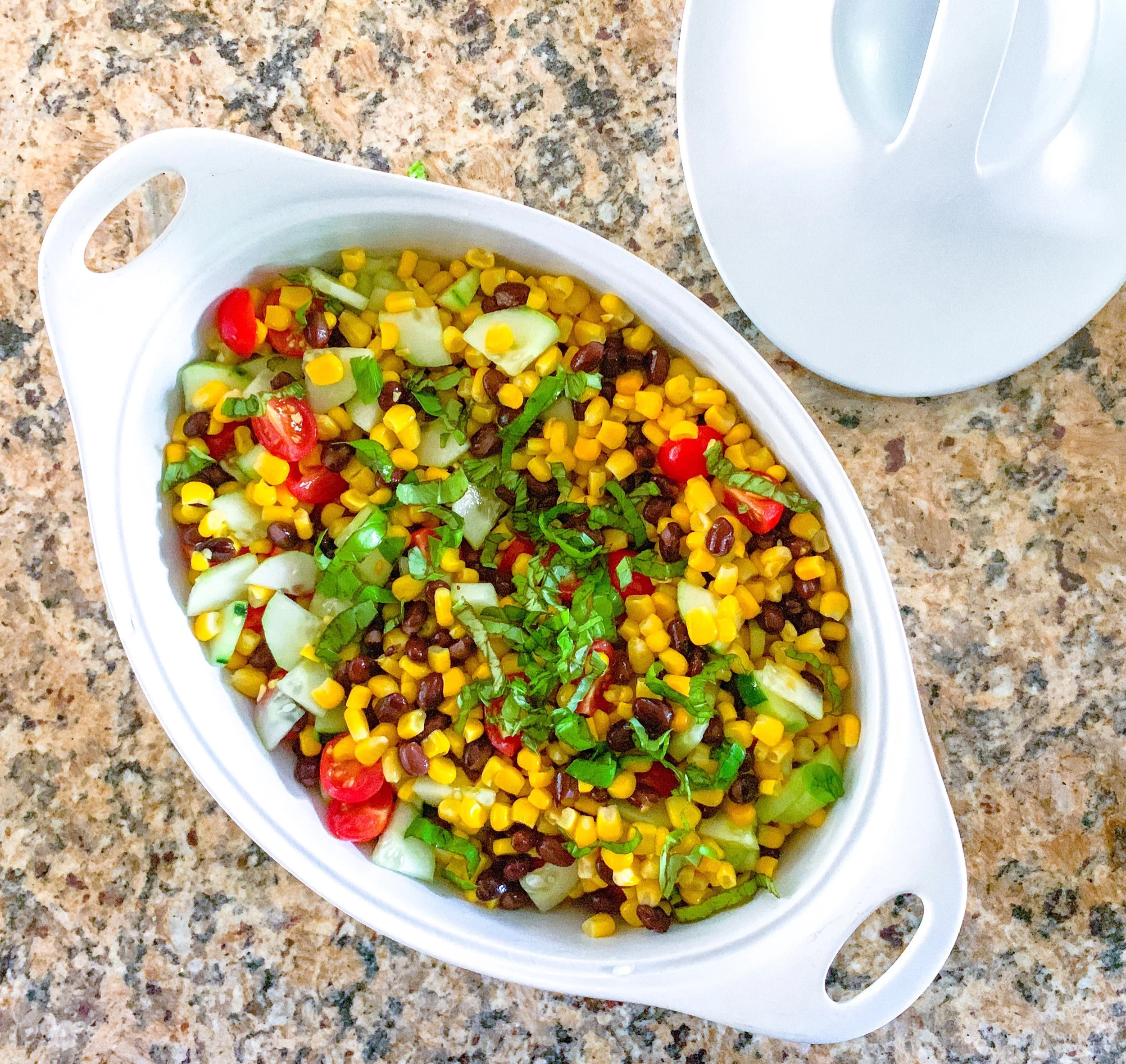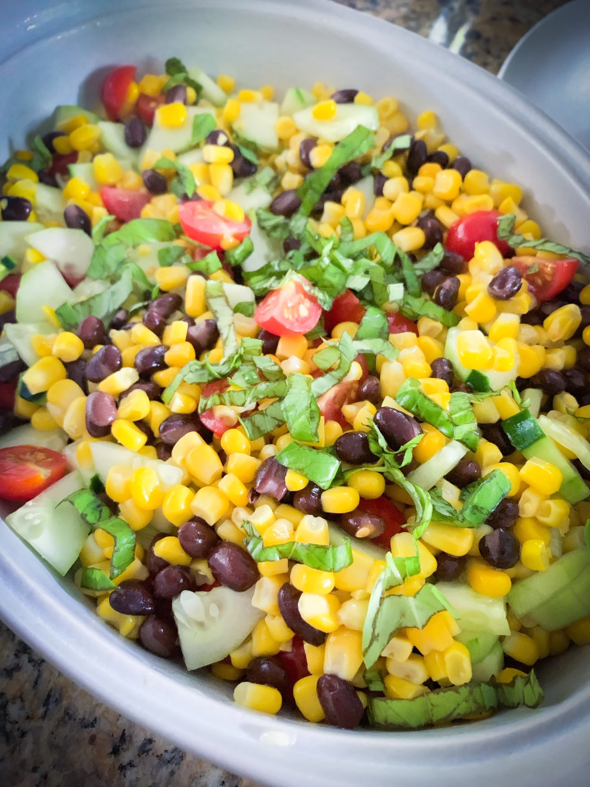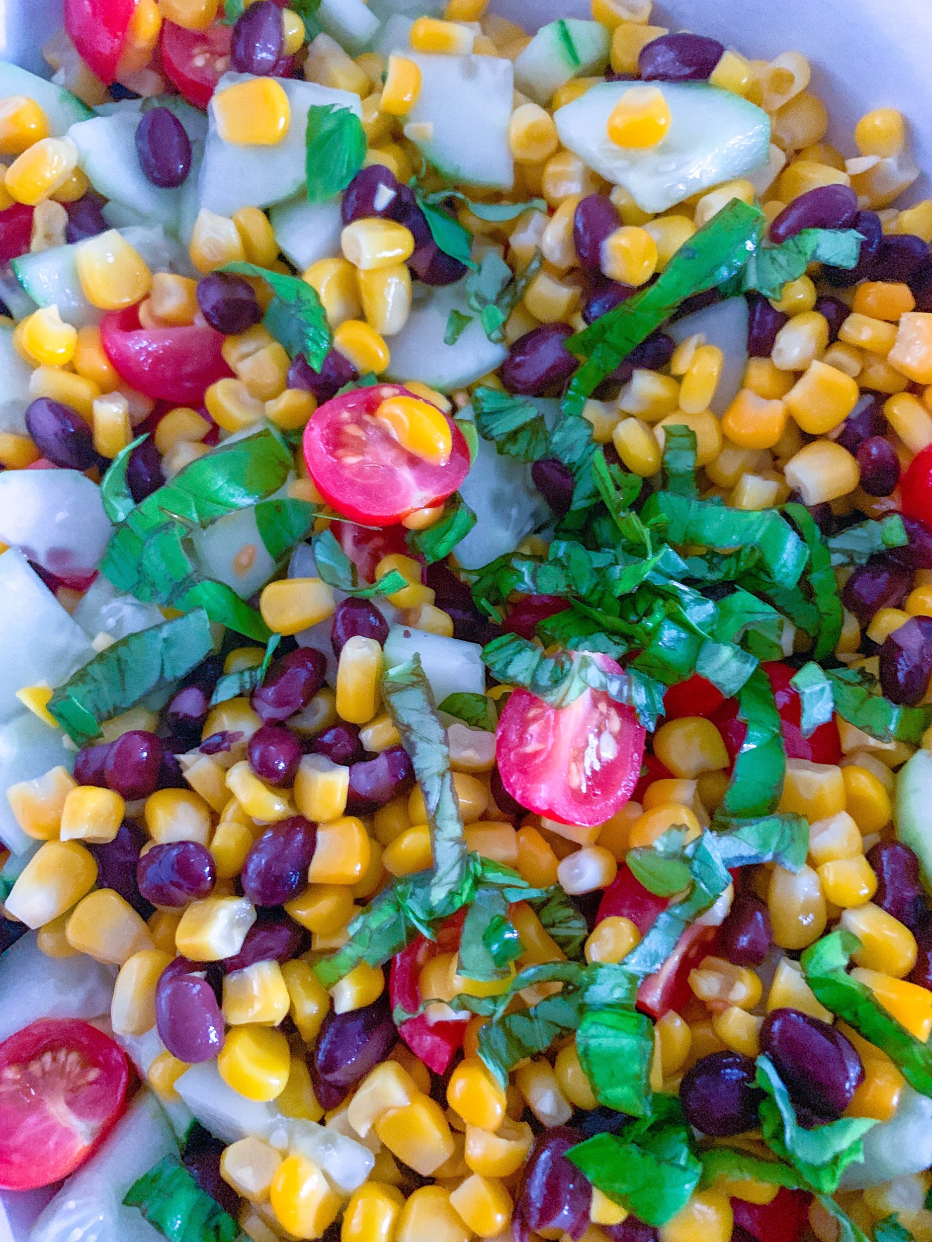 Drain and rinse the can of black beans. Add beans and corn into a large bowl. Sprinkle kosher salt all over halved tomatoes. Next add the tomatoes and cucumbers to the corn and beans. Add dressing* and gently mix until ingredients are fully covered. Garnish with basil right before serving.
