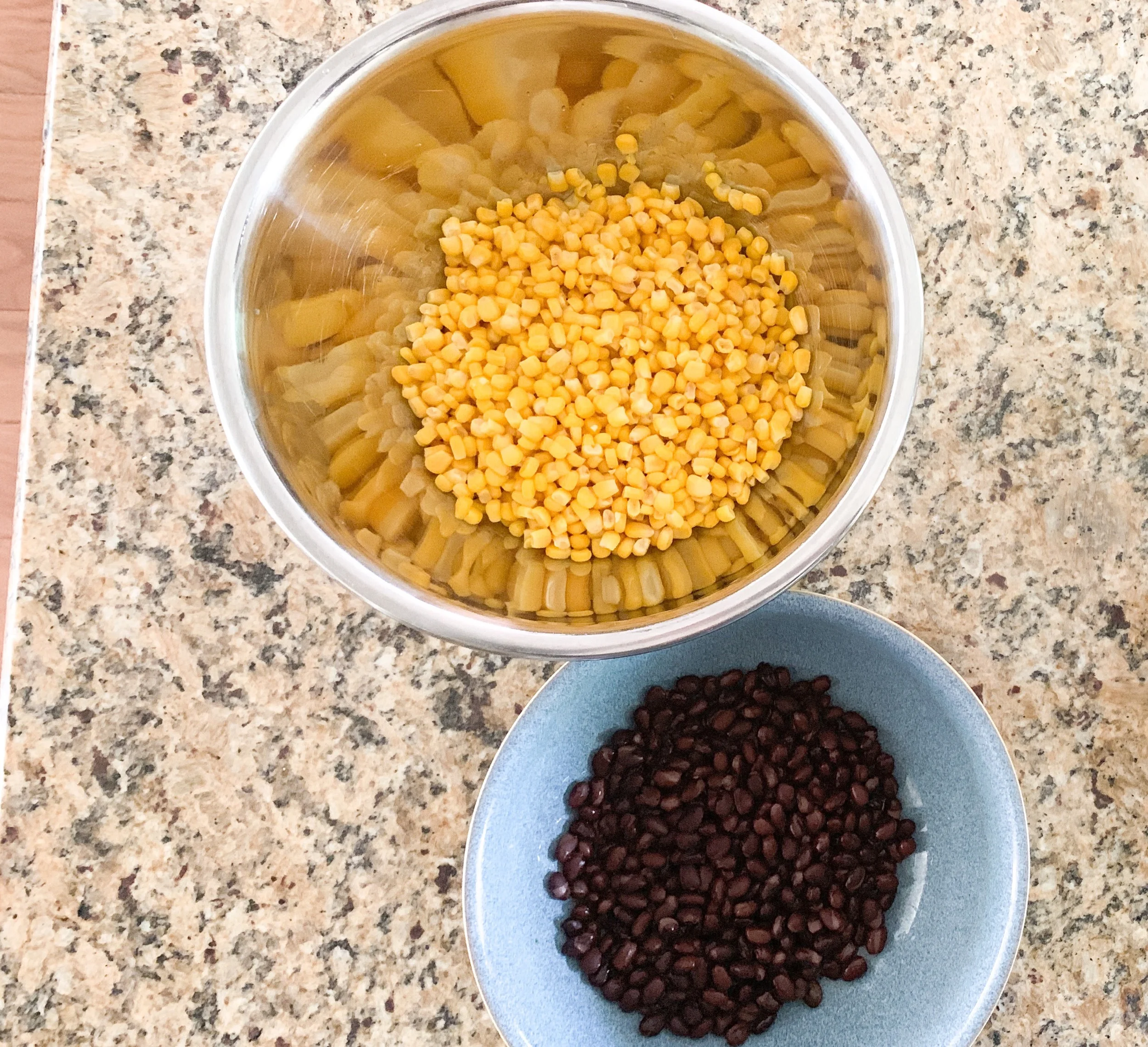 Cook corn according to package directions, I add a few pinches of kosher salt right as the pot begins to boil. Once corn is cooked, rinse it in cold water to stop the cooking process and to keep the gorgeous yellow color vibrant.